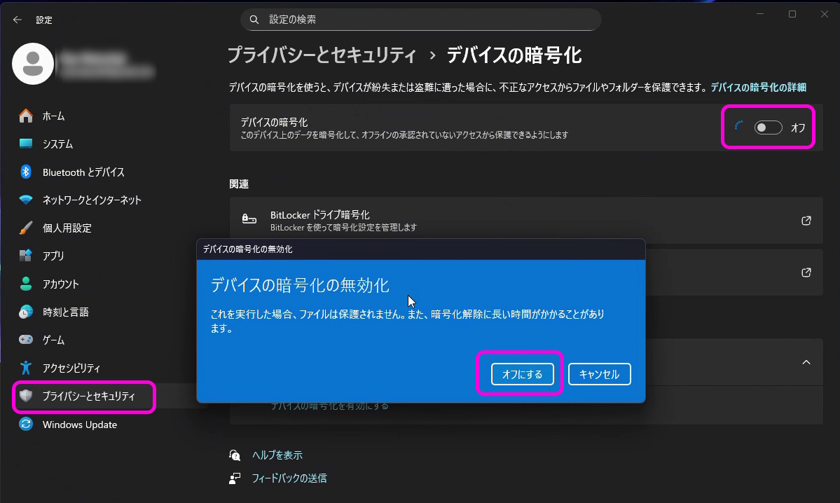 デバイスの暗号化をオフにする場合は以下の手順で行う。