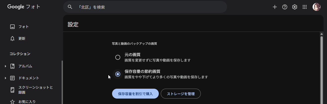 Google フォトの「設定」を開き、バックアップの画質を「元の画質」から「保存容量の節約画質」に変更します。これにより、見た目の美しさを保ちつつ、ファイルサイズを抑えてバックアップできるようになります。この設定はスマートフォンの Google フォトアプリからも変更可能です。