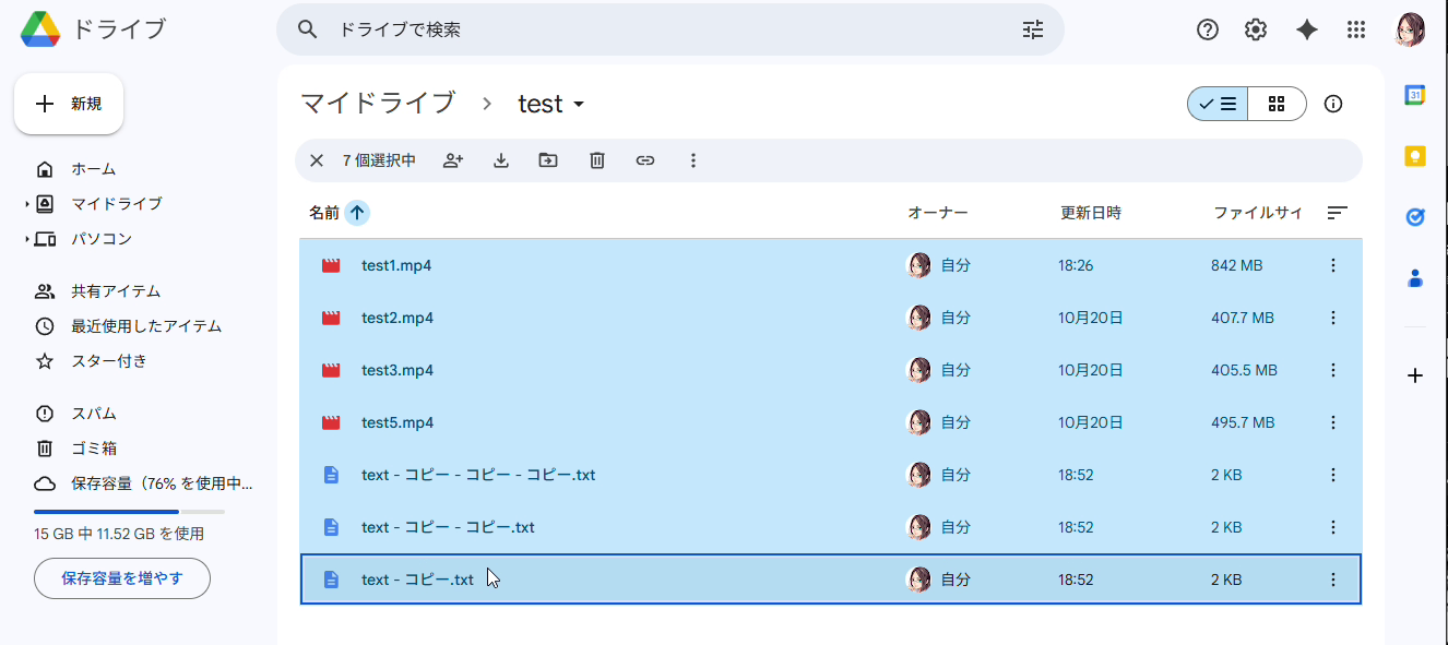 • Google ドライブ: Windows なら Ctrl キー、Mac なら Command キーを同時押ししたり、Shift キーで範囲選択したりすることで、複数のファイルをまとめて選択できます。