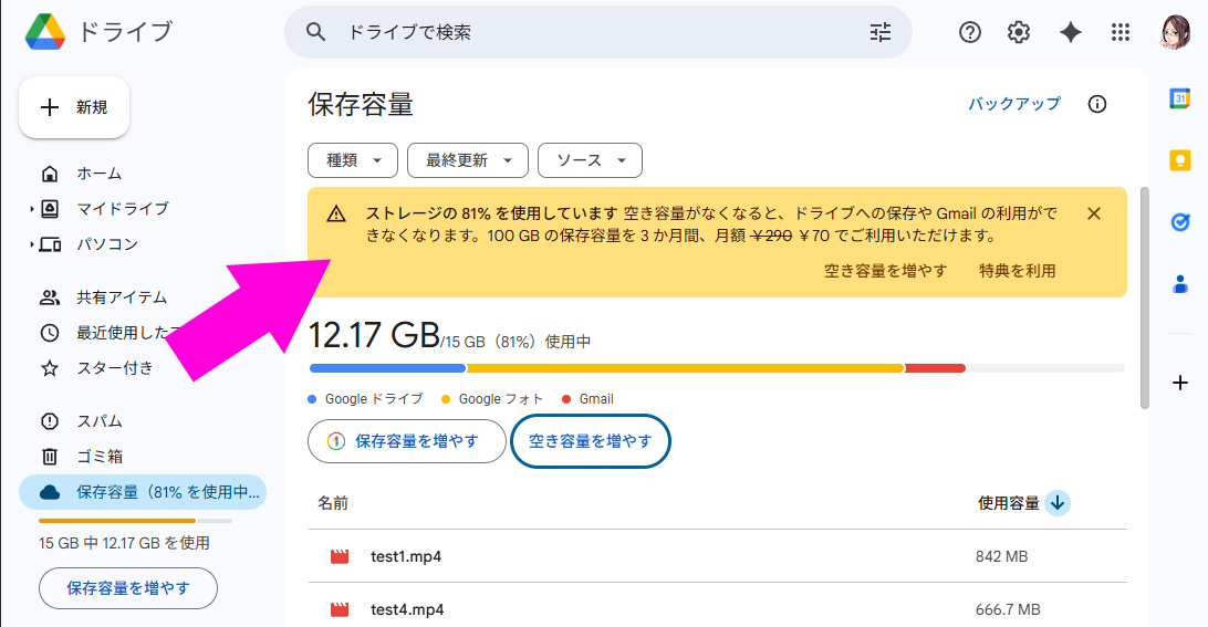 そのため、容量がいっぱいになると、Google ドライブへファイルを追加したり新しい写真を保存したりできなくなるだけでなく、Gmail の送受信ができなくなるといった重大な問題が発生する可能性があります。また、容量不足の状態やアカウントを 2 年以上放置すると、データが削除される恐れがあるため注意が必要です。